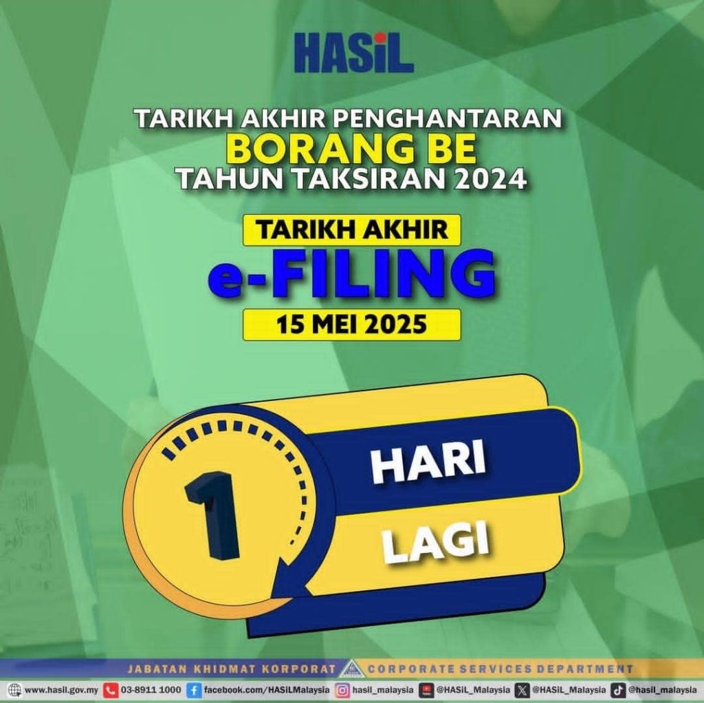 PUTRAJAYA – Lembaga Hasil Dalam Negeri Malaysia (HASiL) mengingatkan orang ramai bahawa tarikh akhir pengemukaan Borang Nyata (BN) Tahun Taksiran 2024 bagi pembayar cukai yang tidak menjalankan perniagaan adalah pada 15 Mei 2025.
