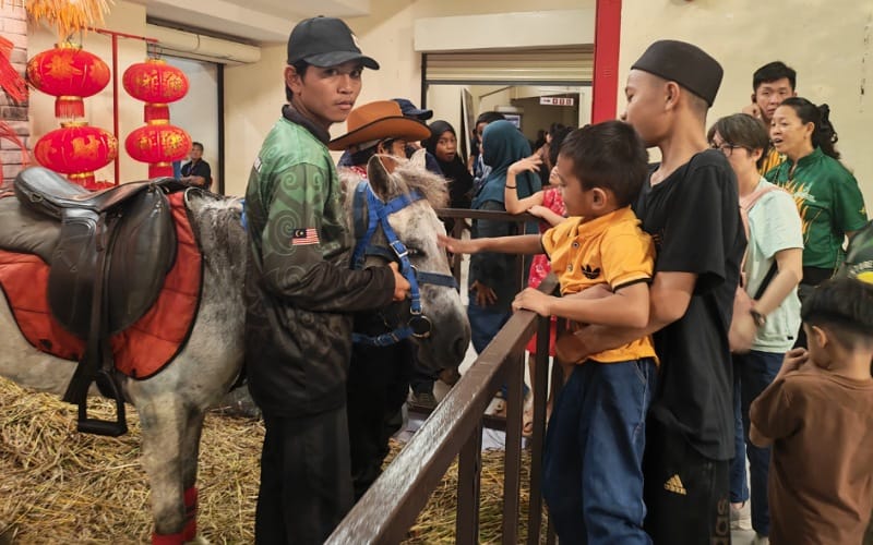 Uniknya, sambutan itu menjadi lebih meriah dengan kehadiran kuda sebagai tarikan utama yang menarik perhatian pengunjung.