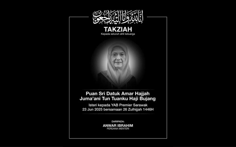 “Saya dan Azizah berduka menerima khabar pemergian Puan Sri Datuk Amar Hajjah Juma’ani Tun Tuanku Haji Bujang, isteri kepada Premier Sarawak, Datuk Patinggi Tan Sri Abang Haji Abdul Rahman Zohari Tun Datuk Abang Haji Openg awal pagi tadi.