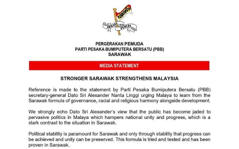 KUCHING – Pergerakan Pemuda Parti Pesaka Bumiputera Bersatu (PBB) Sarawak menggesa kepemimpinan dan rakyat di Semenanjung agar meneladani formula pentadbiran Sarawak yang menekankan kestabilan politik, keharmonian kaum dan pembangunan inklusif demi memperkukuh perpaduan nasional.