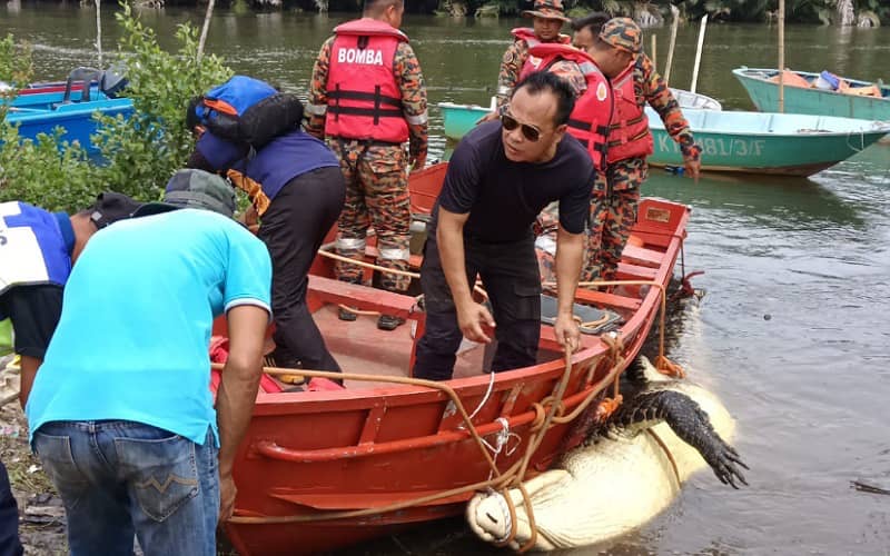 “Tindakan pasukan Bomba mengangkat dan membawa buaya ke darat.