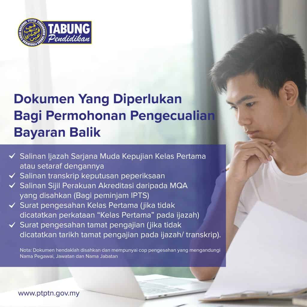 - Mengemukakan permohonan pengecualian bayaran balik di dalam tempoh 12 bulan daripada tarikh konvokesyen.