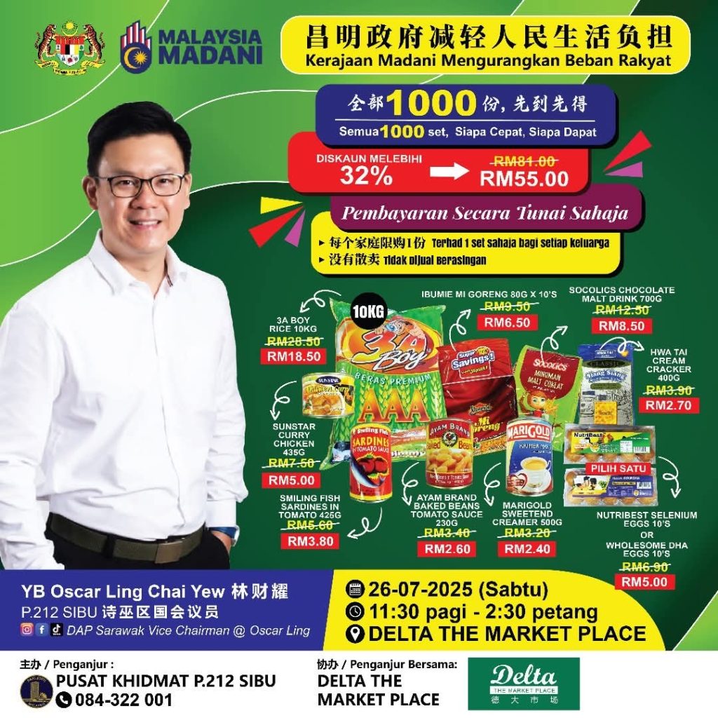 Program yang digerakkan oleh Ahli Parlimen Sibu, Oscar Ling Chai Yew ini menawarkan satu set barangan keperluan asas bernilai RM81 pada harga diskaun hanya RM55, iaitu penjimatan lebih 32 peratus.
