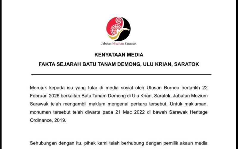 SARATOK – Jabatan Muzium Sarawak (JMS) tampil menjelaskan bahawa monumen bersejarah, Batu Tanam Demong di Ulu Krian di sini telah pun diwartakan sebagai tapak warisan negeri sejak 21 Mac 2022.
