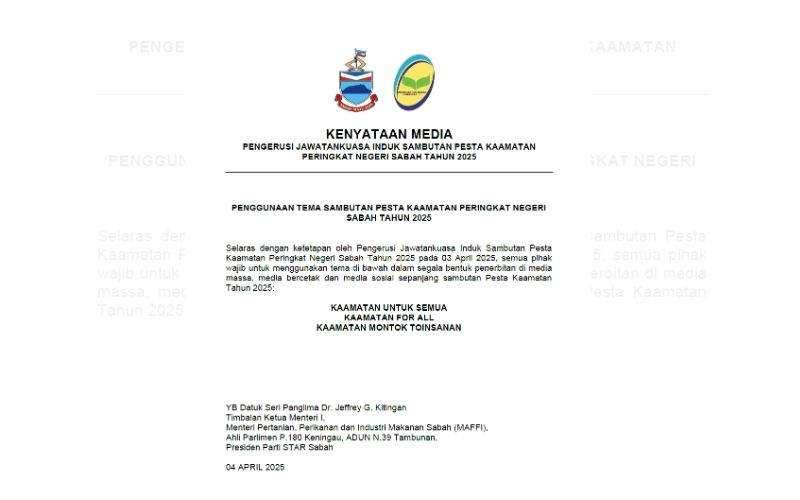 Penggunaan tema itu selaras dengan ketetapan Pengerusi Jawatankuasa Induk Sambutan Pesta Kaamatan 2025, Datuk Seri Dr. Jeffrey Kitingan pada 3 April.
