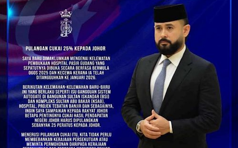JOHOR BAHRU – Pemangku Sultan Johor, Tunku Mahkota Ismail Sultan Ibrahim bertitah agar Kerajaan Persekutuan memulangkan semula cukai negeri ini sebanyak 25 peratus daripada kadar keseluruhan yang diterima.