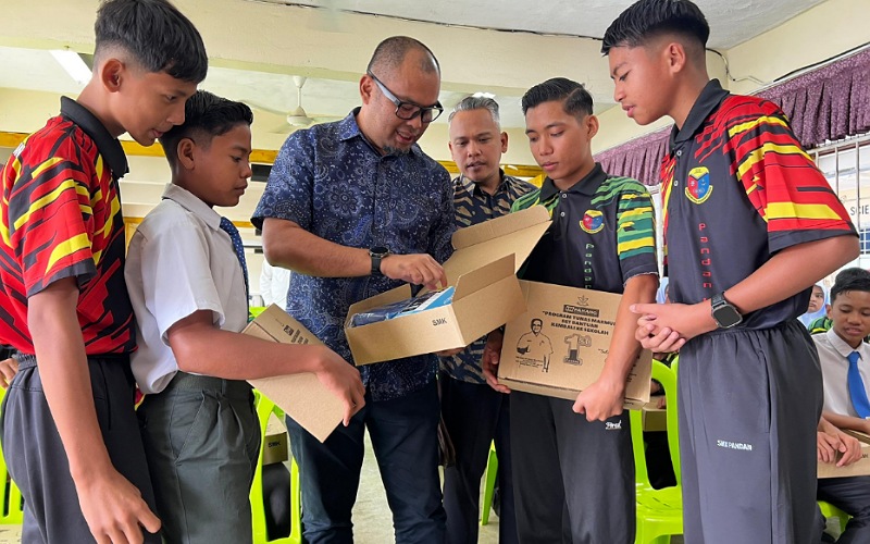 Penyelaras DUN Panching, Hasrul Afizan Mohd Din menyerahkan kit Tunas Makmur kepada kira-kira 80 pelajar dalam satu majlis ringkas di Sekolah Menengah Kebangsaan (SMK) Pandan.