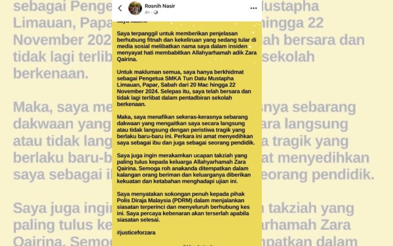 Dalam pada itu, Rosnih merakamkan ucapan takziah yang paling tulus kepada keluarga Allahyarham adik Zara Qairina dan berharap keluarganya diberikan kekuatan dan ketabahan menghadapi ujian ini.