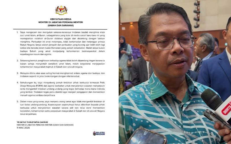 KOTA KINABALU – Menteri di Jabatan Perdana Menteri (Sabah dan Sarawak), Datuk Ts. Mustapha Sakmud mengecam dan mengutuk sekeras-kerasnya tindakan menghina kitab suci umat Islam, al-Quran, yang tular di media sosial baru-baru ini.