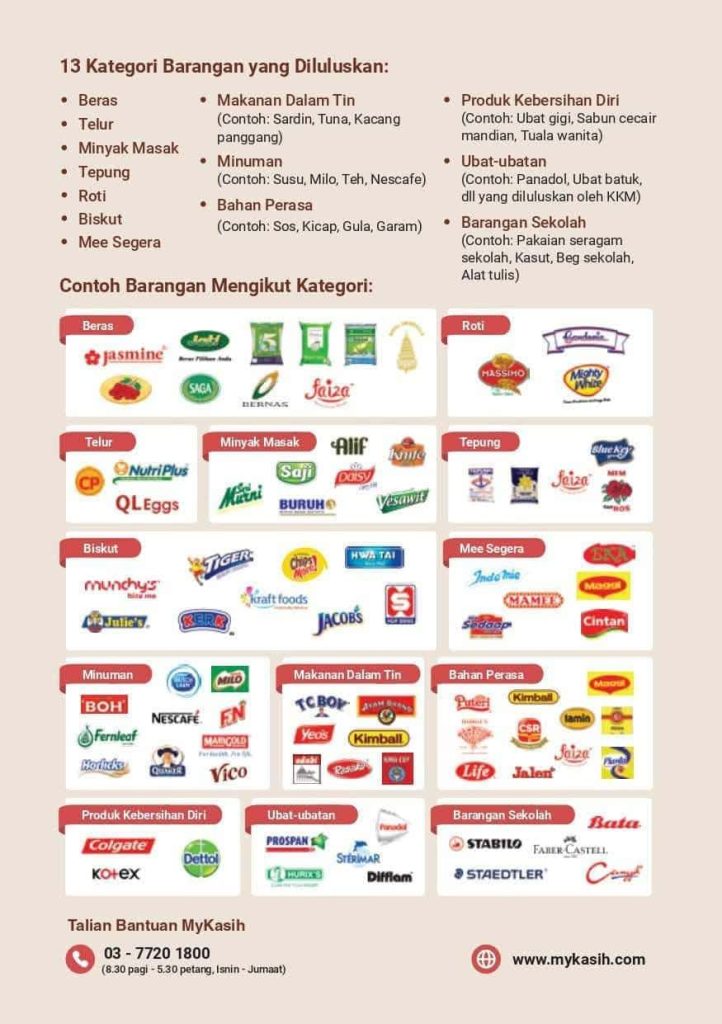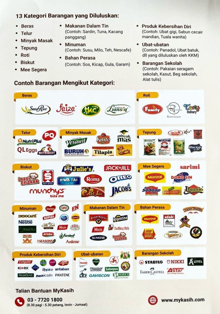 Penerima boleh membeli barangan keperluan asas daripada 13 kategori produk yang diluluskan iaitu beras, roti, telur, minyak masak, tepung, biskut, mi segera, minuman, makanan dalam tin, bahan perasa, produk kebersihan, ubat-ubatan dan barangan persekolahan.