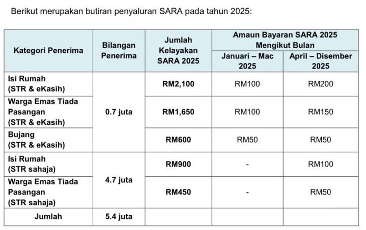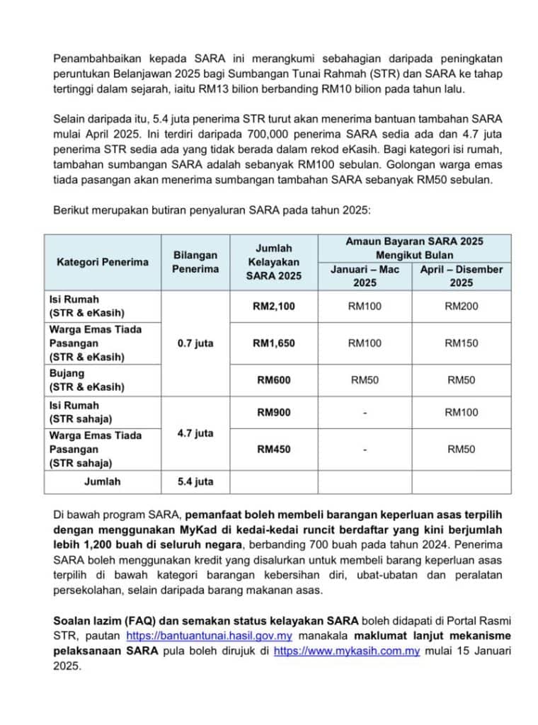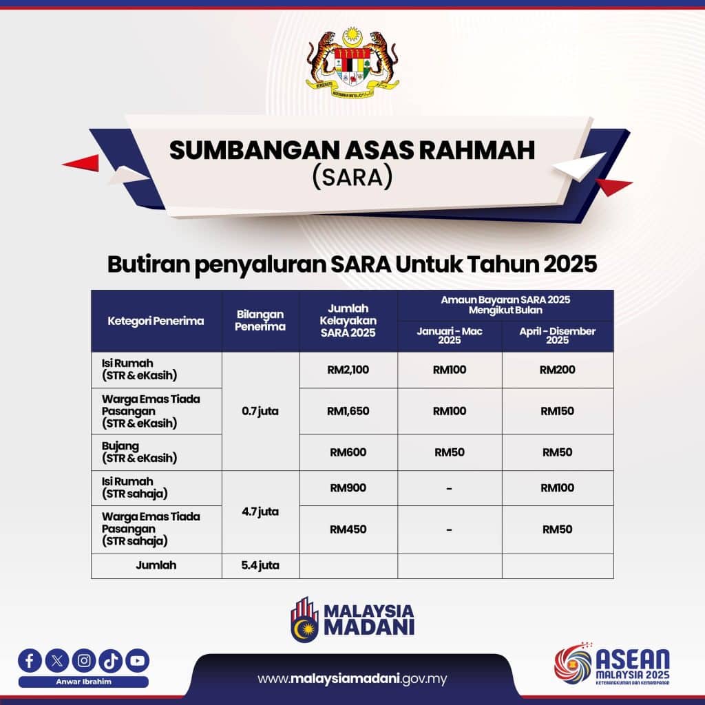 Mulai 1 April 2025 (Selasa), bantuan Sumbangan Asas Rahmah (SARA) akan dikreditkan setiap bulan ke dalam MyKad penerima di seluruh negara, termasuk Sabah, Sarawak dan Wilayah Persekutuan Labuan.