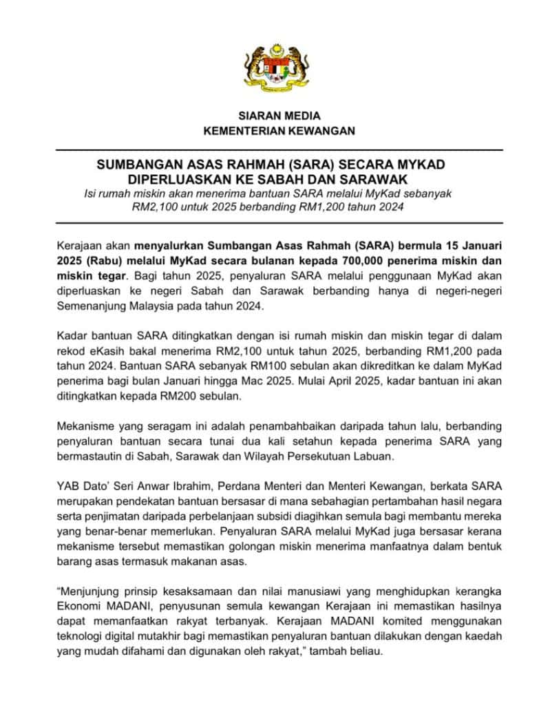 SIARAN MEDIA MOF BERKENAAN SUMBANGAN ASAS RAHMAH (SARA) SECARA MYKAD DIPERLUASKAN KE SABAH DAN SARAWAK