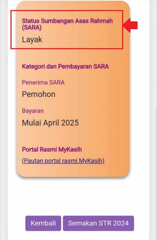 Selain membuat semakan di portal MyKasih, anda boleh semak status SARA anda di website Bantuan Hasil @ Sumbangan Tunai Rahmah 2025.
