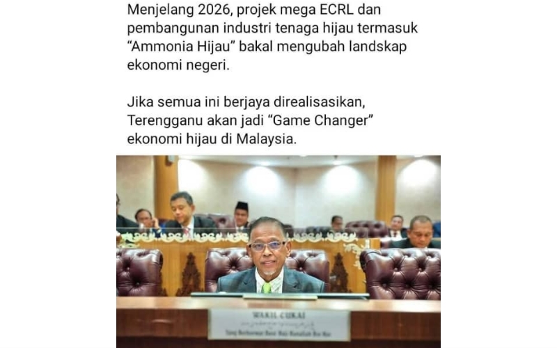 Dalam kenyataan itu, ADUN Chukai mendakwa projek mega ECRL dan pembangunan industri tenaga hijau termasuk Ammonia Hijau bakal mengubah landskap ekonomi negeri. Namun fakta sebenar amat jelas kedua-duanya ialah projek Persekutuan, bukan inisiatif negeri.