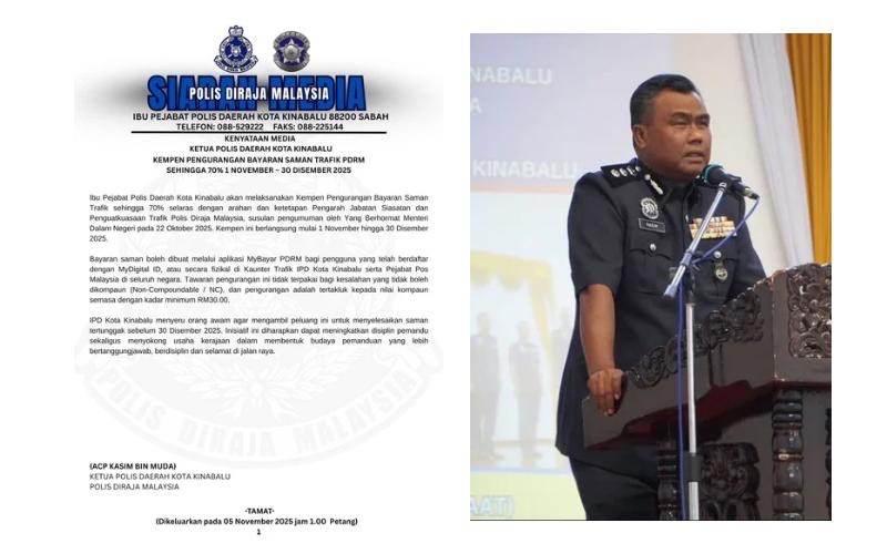 KOTA KINABALU – Ibu Pejabat Polis Daerah Kota Kinabalu melaksanakan Kempen Pengurangan Bayaran Saman Trafik sehingga 70 peratus selaras dengan arahan dan ketetapan Pengarah Jabatan Siasatan dan Penguatkuasaan Trafik Polis Diraja Malaysia (PDRM).