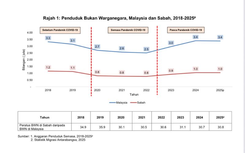 “Manakala dari segi bilangan tertinggi penduduk bukan warganegara di Sabah pula direkodkan pada 2018 iaitu seramai 1,158.7 ribu orang, berbanding anggaran bagi tahun 2025 yang masih berada di bawah paras tersebut,” katanya dalam kenyataan media, pada Khamis.