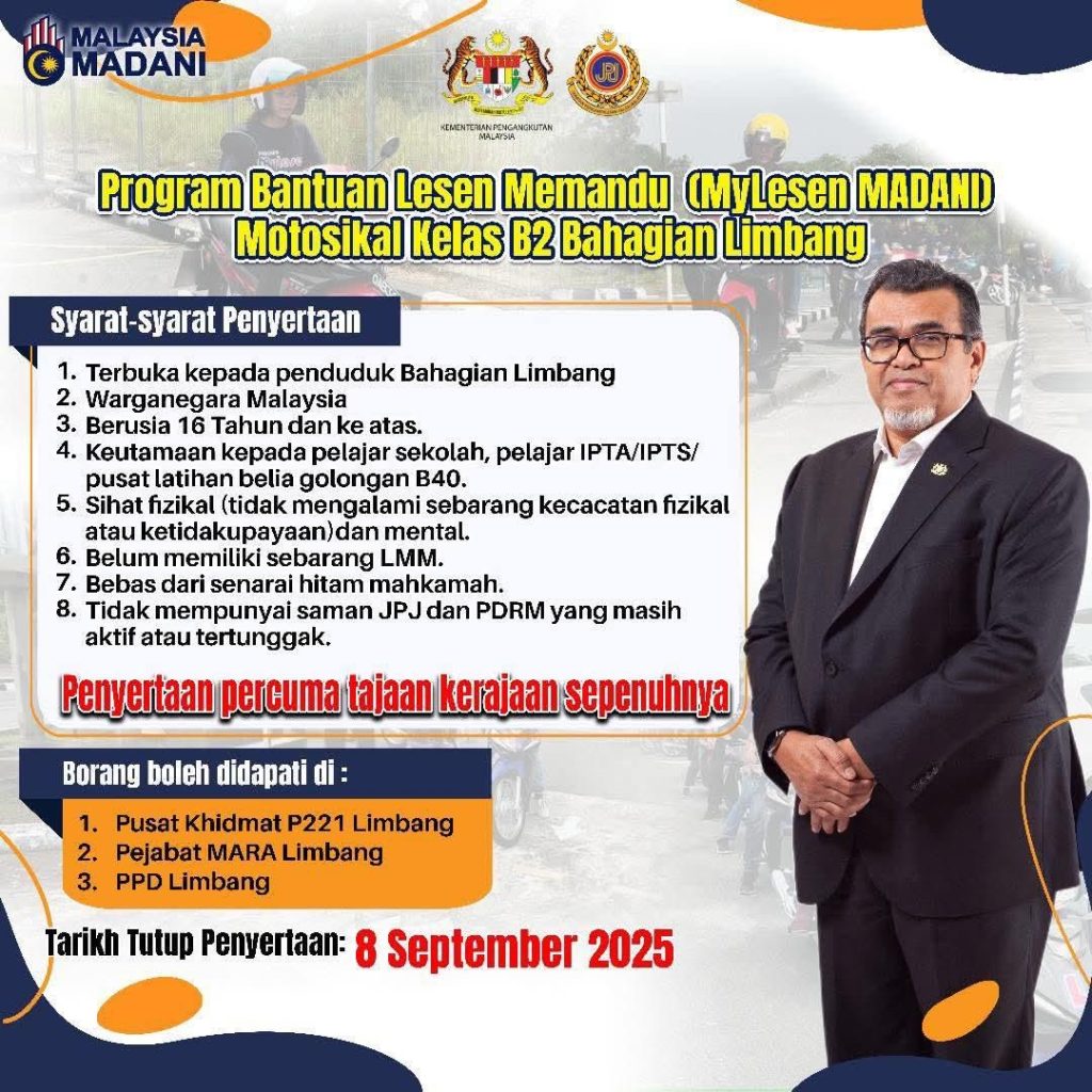 LIMBANG – Penduduk Limbang yang berumur 16 tahun ke atas berpeluang memperoleh Lesen Memandu Motosikal Kelas B2 secara percuma melalui Program Bantuan Lesen Memandu (MyLesen MADANI) yang dibiayai sepenuhnya oleh kerajaan.