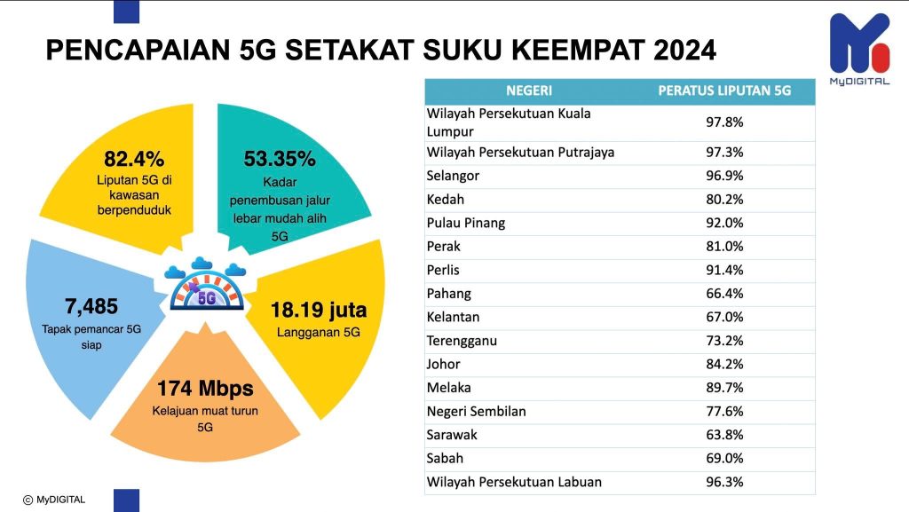 Berdasarkan infografik yang dikongsikan, liputan 5G tertinggi adalah di Kuala Lumpur iaitu mencecah 97.8 peratus, diikuti 97.3 peratus di Putrajaya, 96.9 peratus di Selangor, 96.3 peratus di Labuan, 92 peratus di Pulau Pinang, 91.4 peratus di Perlis dan 89.7 peratus di Melaka.