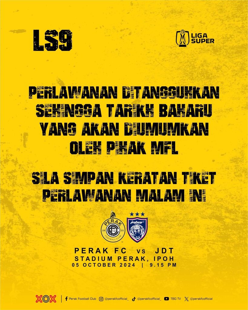 “Bagi pihak Perak FC, kami sekali lagi memohon maaf di atas kesulitan ini (penangguhan kedua). Keputusan telah dibuat oleh pihak MFL dan jangan lupa menyimpan keratan tiket untuk ditebus pada perlawanan yang akan ditentukan kelak,” kata jurucakap Perak FC pada hantaran tersebut.