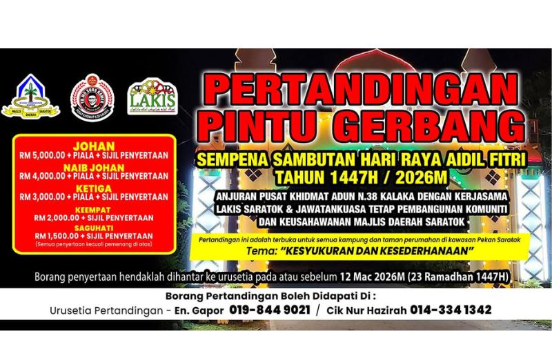 Pada Ramadan dan Aidilfitri tahun ini, Pertandingan Pintu Gerbang Sempena Sambutan Hari Raya Aidilfitri adalah anjuran Pusat Khidmat ADUN Kalaka dengan kerjasama Lakis Saratok dan Jawatankuasa Tetap Pembangunan Komuniti dan Kesejahteraan Majlis Daerah Saratok.