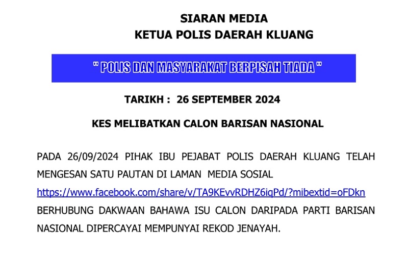 “Hari ini pihak Ibu Pejabat Polis Daerah Kluang telah mengesan satu pautan di laman media sosial berhubung dakwaan bahawa isu calon daripada parti BN dipercayai mempunyai rekod jenayah.