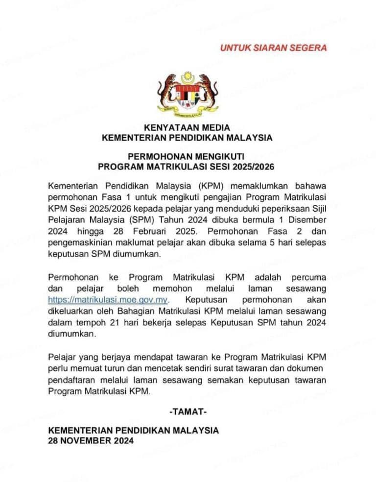 UNTUK makluman, Permohonan Fasa 1 untuk mengikuti pengajian Program Matrikulasi Kementerian Pendidikan (KPM) sesi 2025/2026 dibuka bermula 1 Disember 2024.