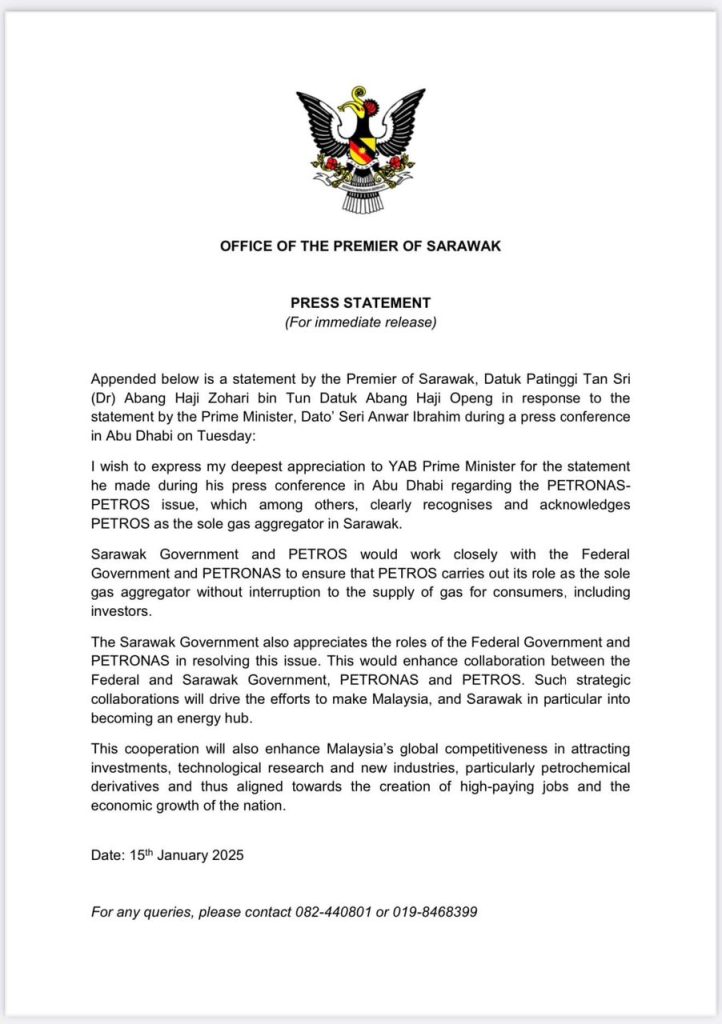 Premier Sarawak Tan Sri Abang Johari Tun Openg menerusi kenyataan rasmi hari ini berkata kenyataan Perdana Menteri semasa di Dubai jelas mengiktiraf dan mengesahkan PETROS sebagai agregator gas tunggal di Sarawak.