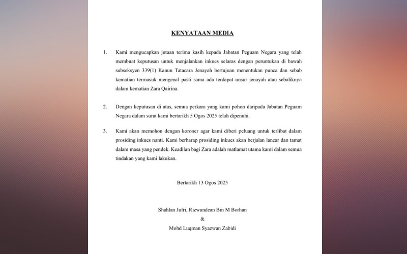KOTA KINABALU – Pasukan guaman keluarga Allahyarhamah Zara Qairina Mahathir menyatakan semua permohonan yang dikemukakan kepada Jabatan Peguam Negara (AGC) telah dipenuhi, termasuk keputusan untuk menjalankan inkues bagi menentukan punca kematian pelajar itu.