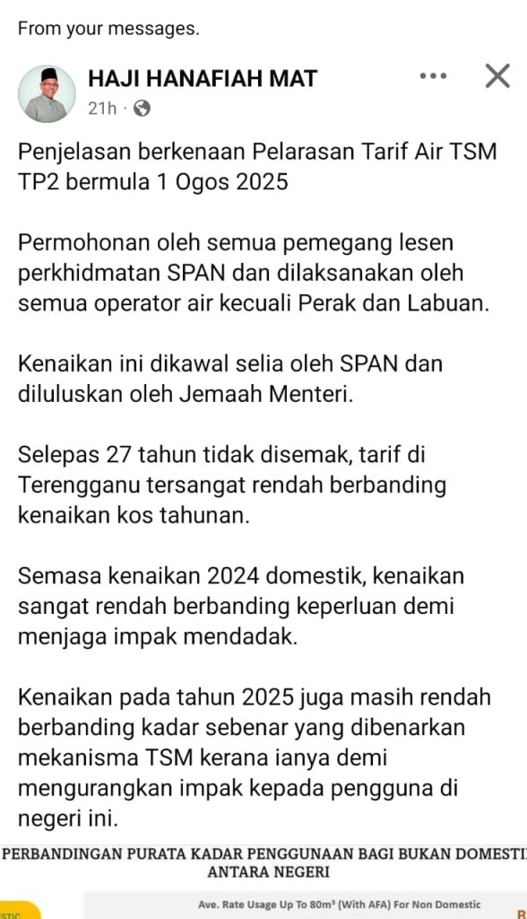 KENYATAAN ADUN Chukai, Datuk Hanafiah Mat berhubung pelarasan tarif air mulai 1 Ogos 2025 melalui hantaran di laman Facebook beliau hanya mendedahkan satu perkara: Kerajaan Negeri Pas gagal mengurus, lalu rakyat menjadi mangsa.