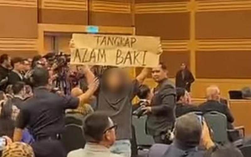Tidak lama selepas itu, seorang lagi individu muncul dari arah belakang dengan salah seorang daripada mereka dilihat membawa sepanduk yang menggesa penahanan Azam berkait isu konflik yang dibangkitkan sebelum ini.