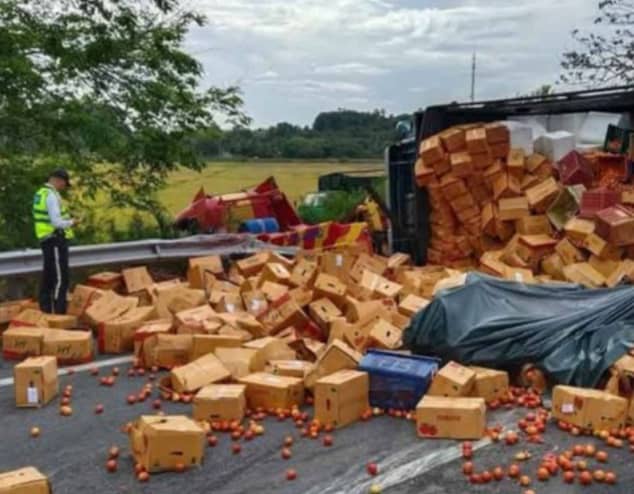 “Trak tunda tersebut terbabas ke tali air di kiri jalan manakala lori yang membawa muatan buah tomato terbalik dan melintang lebuh raya.