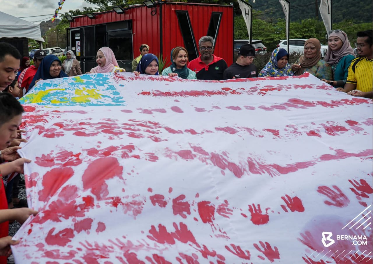 KANGAR – Keberangkatan Raja Puan Muda Perlis, Tuanku Dr. Hajah Lailatul Shahreen Akashah Khalil menyemarakkan lagi semangat patriotik apabila baginda turut serta menghasilkan Jalur Gemilang menggunakan teknik capan tapak tangan bersama 40 pelatih Pertubuhan Pemulihan Dalam Komuniti (PPDK) Jauhar Jannah.
