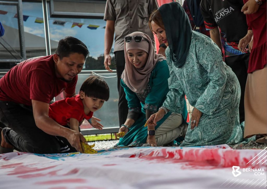 Baginda Tuanku Lailatul Shahreen bersama ibu bapa dan pelatih PPDK berganding bahu menyiapkan Jalur Gemilang hasil gabungan capan tapak tangan di atas kain putih yang disediakan khas.