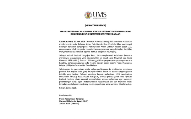 Dalam kenyataan media pada Jumaat, UMS berkata, pihak universiti menghormati kebebasan bersuara mahasiswa seperti yang termaktub di bawah Akta Universiti dan Kolej Universiti 1971 (AUKU).