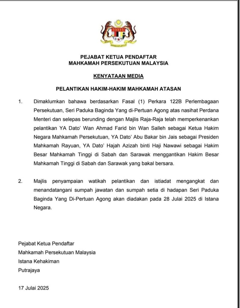 “Majlis penyampaian watikah pelantikan dan istiadat mengangkat dan menandatangani sumpah jawatan dan sumpah setia di hadapan Seri Paduka Baginda Yang Di-Pertuan Agong akan diadakan pada 28 Julai 2025 di Istana Negara,” kata kenyataan itu.