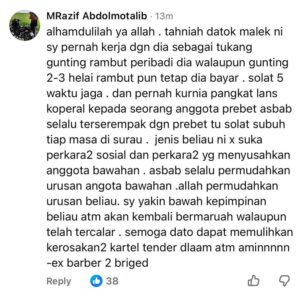 Seorang pengguna di Facebook, MRazif Abdolmotalib berkata, dia pernah berkhidmat sebagai tukang gunting rambut peribadi Malek Razak dan terkesan dengan sikap rendah diri serta keikhlasan beliau.
