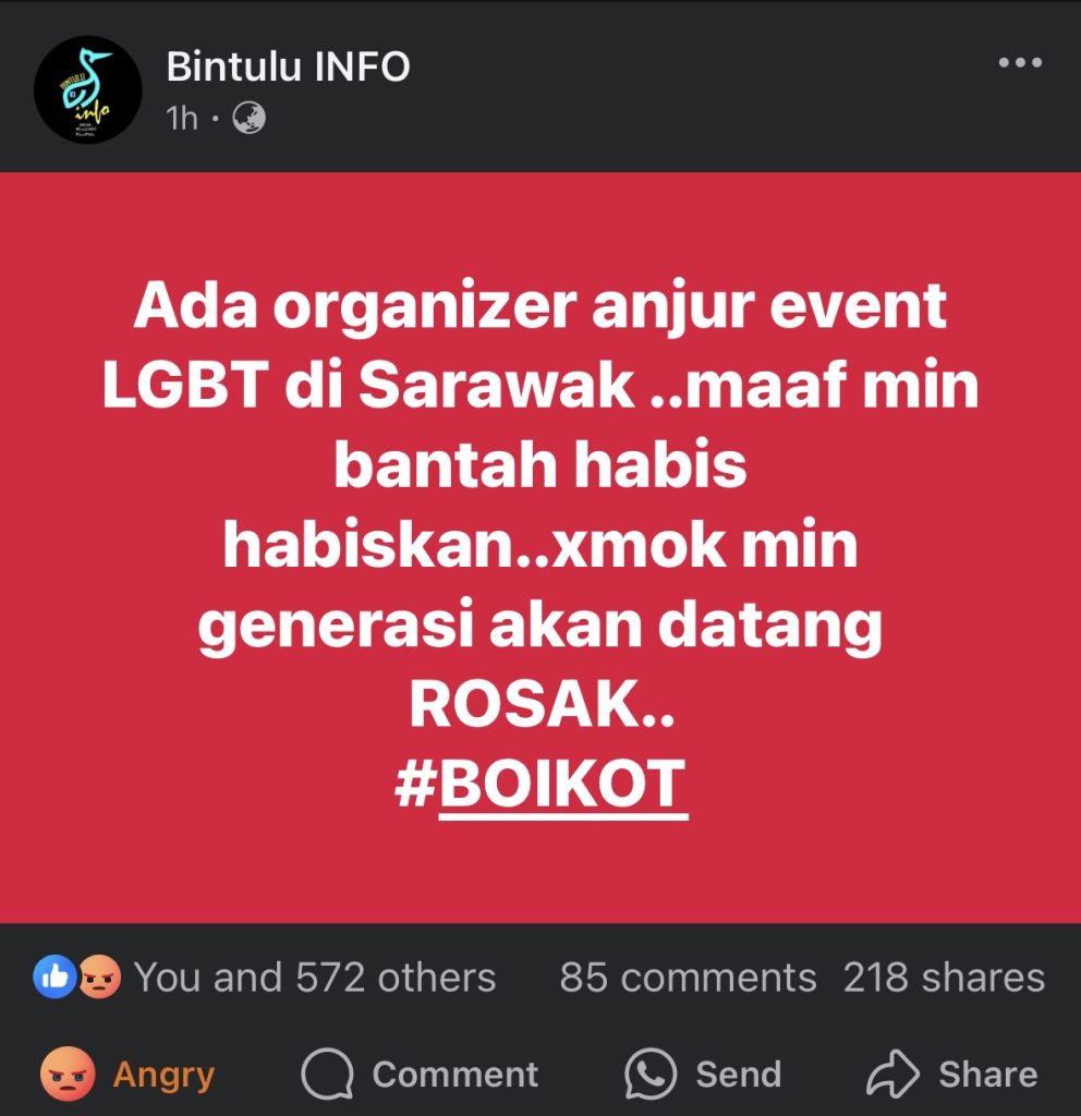 “Tolong pihak berkuasa ambil tindakan. Jangan biarkan budaya songsang menular di bumi Kenyalang,” tulis seorang pengguna Facebook.