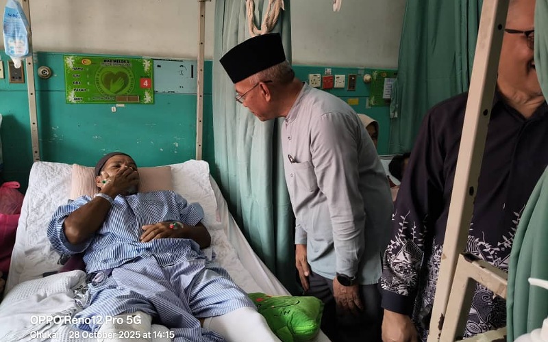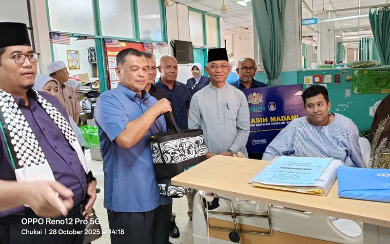 KEMAMAN — Yang Dipertua Yayasan Dakwah Islamiah Malaysia (YADIM), Datuk Dr Hasan Bahrom meluangkan masa menyantuni pesakit di Hospital Kemaman menerusi program Ziarah Kasih MADANI, hari ini.
